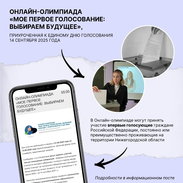 Избирательная комиссия Нижегородской области совместно с Молодежной избирательной комиссией, Министерством образования и науки Нижегородской области и НЦ «Сфера» приглашает молодых избирателей принять участие в онлайн-олимпиаде «Мое первое голосование: выбираем будущее»!