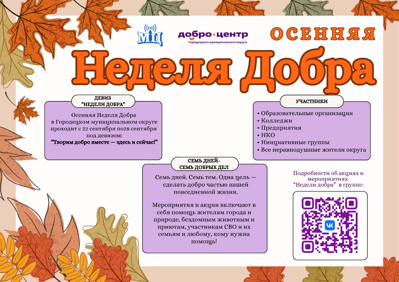 Городецкий округ, встречай "Осеннюю неделю добра - 2025"! Молодёжный центр и Добро. Центр Городецкого муниципального округа приглашают вас присоединиться к масштабной акции добра, которая пройдет с 22 по 28 сентября! Семь дней, семь смыслов, одна большая цель: сделать добро неотъемлемой частью нашей жизни! Каждый день недели посвящен своей теме: