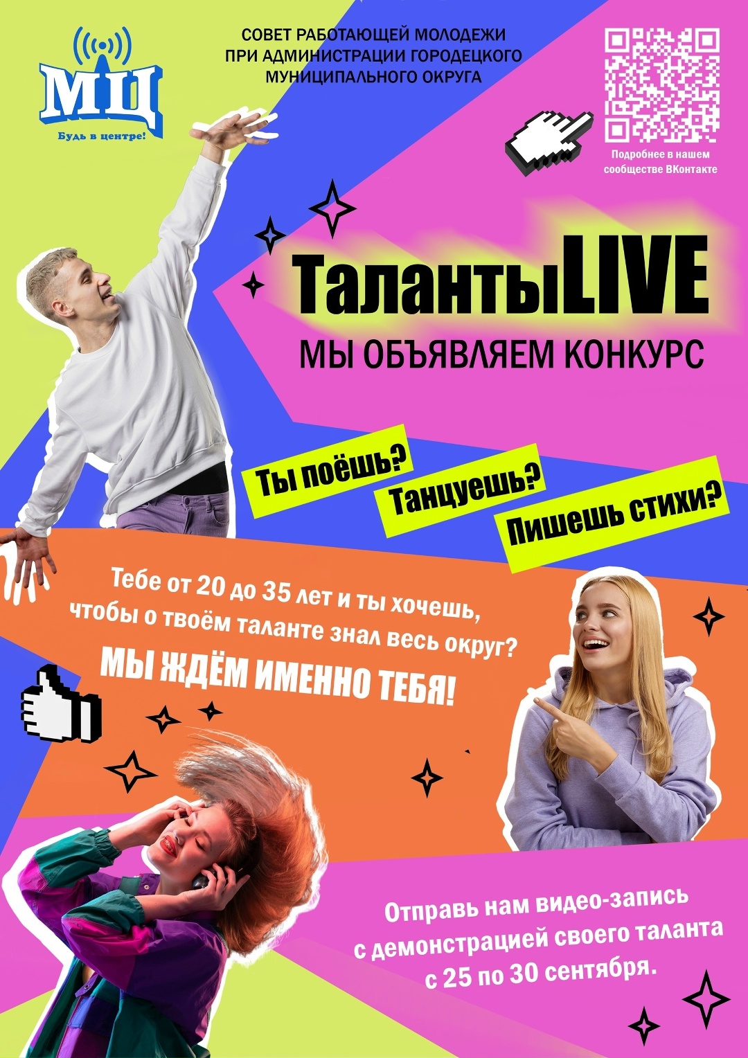 Совет работающей молодежи при администрации Городецкого округа предлагает тебе показать всем, что ты - ТАЛАНТЛИВ! Принимай участие в конкурсе "ТалантыLIVE"