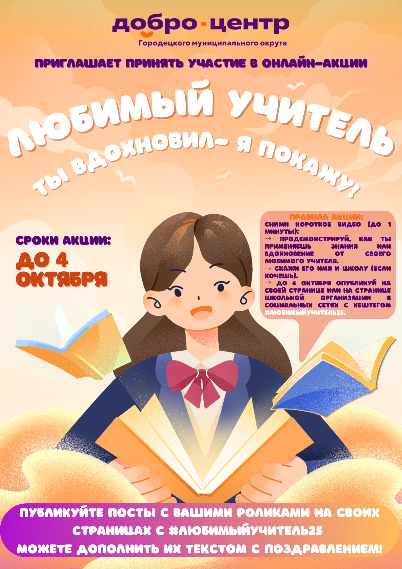 Скажи его имя и школу (если хочешь). До 4 октября опубликуй видео на своей странице или странице школьной организации в социальных сетях с хештегом Можешь дополнить его текстом с поздравлением! Это не просто благодарность.