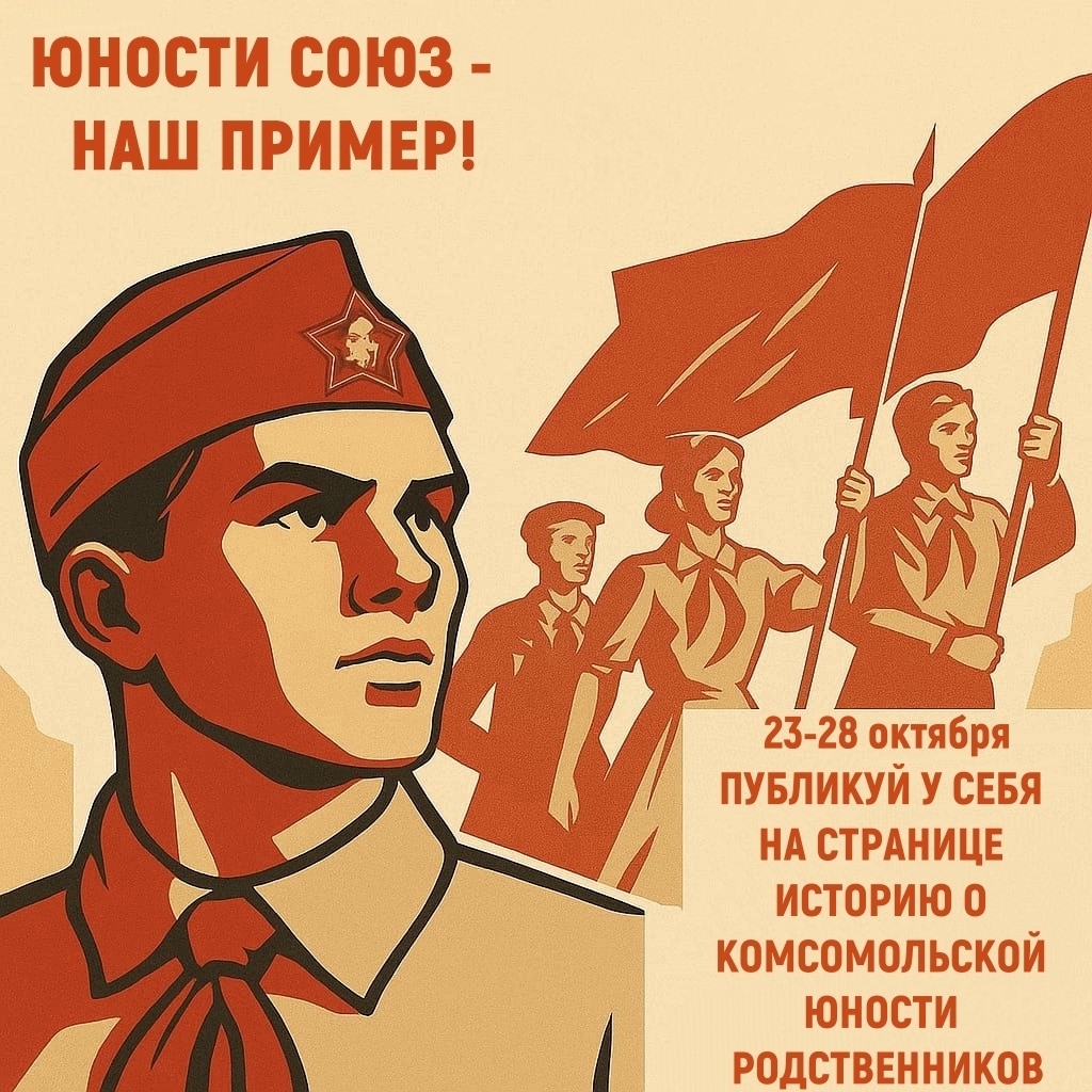 Онлайн-акция "Юности вашей союз - наш пример!" Дорогие друзья! Приглашаем вас принять участие в уникальной онлайн-акции, посвященной комсомольской юности наших родителей, бабушек и дедушек! Поделитесь на своей странице историями о том, как комсомол формировал характер и жизненные ценности ваших близких. И конечно, почему они для вас - пример для подражания в ваших активностях! Пусть их вдохновляющий опыт станет примером для нового поколения! Сроки акции: 23 - 29 октября Как участвовать: 1. Напишите историю о комсомольской юности ваших родных. 2. Опубликуйте её на своей странице с хэштегами: Давайте вместе вспомним и отметим важные моменты истории, которые продолжают вдохновлять нас и сегодня! Вперёд, к новым свершениям!