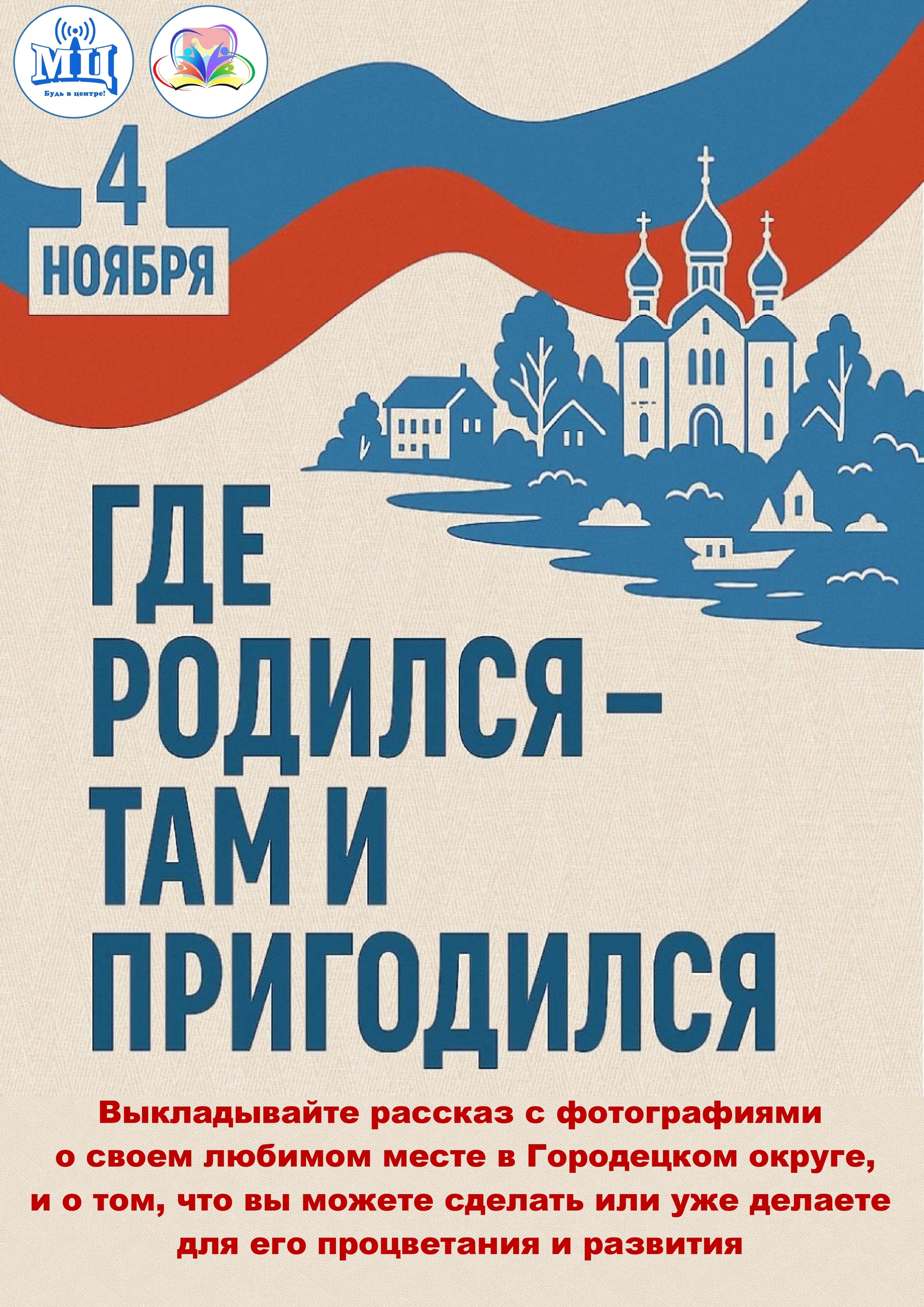 Совет старшеклассников Городецкого округа приглашает присоединиться к акции "ГДЕ РОДИЛСЯ - ТАМ И ПРИГОДИЛСЯ" 4 ноября - вместе с нами! Расскажите о своём любимом месте в Городецком округе: опубликуйте фото или видео, короткую историю и — самое важное — напишите, что вы уже делаете и что готовы сделать для улучшения жизни округа. Покажите реальные дела: субботники, волонтёрские инициативы, помощь соседям, участие в проектах по благоустройству, идеи для парка или школы — всё важно! Как поучаствовать: Опубликуйте фото/видео любимого места; В тексте укажите: где это, почему оно дорого вашему сердцу и какие конкретные шаги вы уже предпринимаете или планируете; Отметьте организаторов и поставьте хэштеги: #ГдеРодилсяТамИПригодился#ГородецкийОкруг#ДеньНародногоЕдинства#СоветСтаршеклассников#ДеньНародногоЕдинства#РоссияСемьяСемей Вдохновляйте других своим примером — вместе мы сделаем наш округ еще лучше!