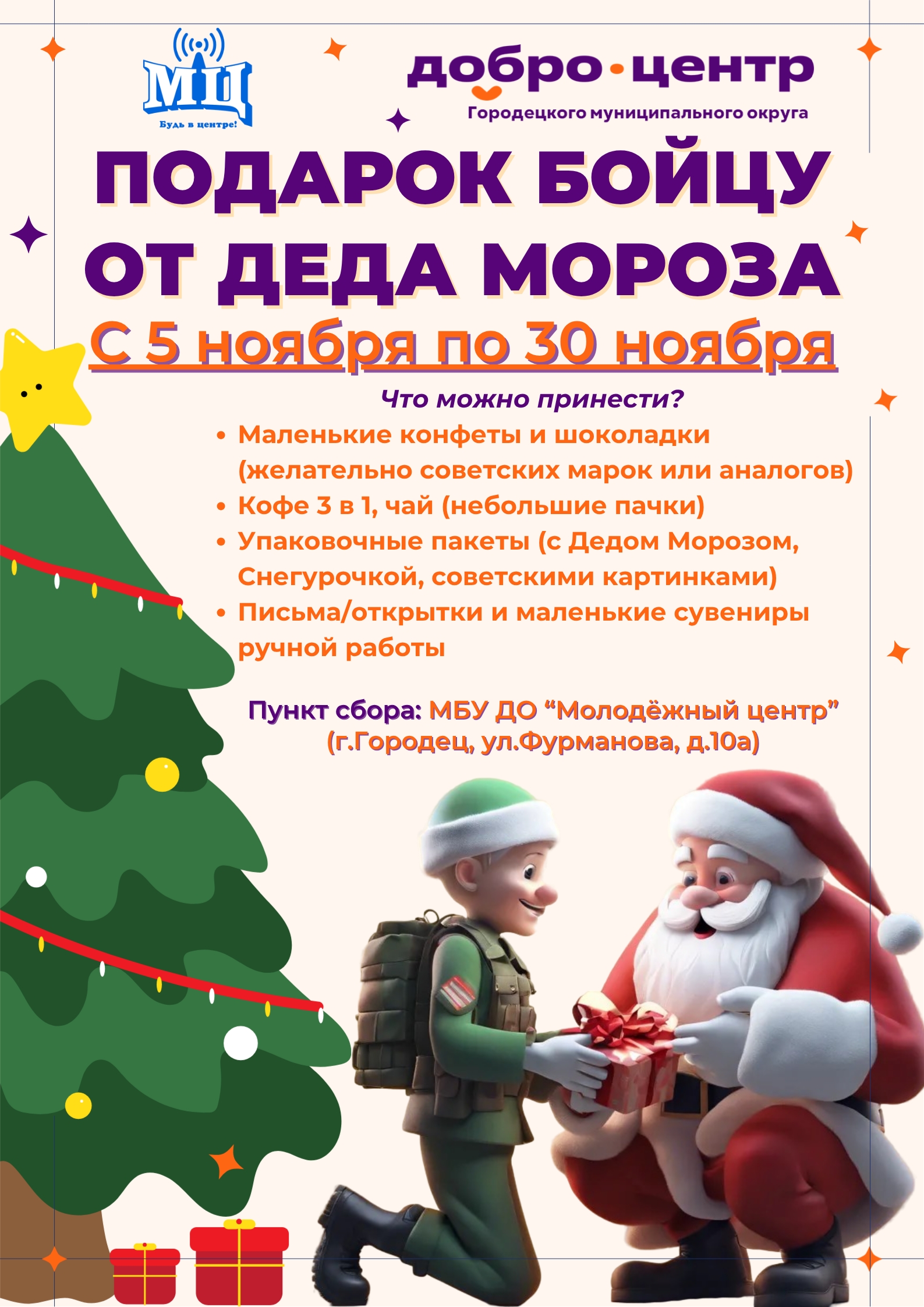 Продолжаем добрую традицию в преддверии Нового года! В этом году мы снова запускаем акцию «Подарок бойцу от Деда Мороза» - чтобы наши защитники, находясь вдали от дома, почувствовали тёплую атмосферу праздника, детства и заботы. Вспомните: новогодний подарок с «Коровкой», «Мишкой на севере», шоколадом и печеньем - это же настоящее волшебство! Давайте соберём такие же сладкие наборы - с любовью, ностальгией и благодарностью. Что принимаем:-Конфеты и шоколадки-Кофе 3 в 1, чай - в индивидуальных пакетиках-Упаковочные пакеты - с Дедом Морозом, Снегурочкой, советскими мотивами. -Письма и открытки от детей - с добрыми словами, рисунками, пожеланиями -Маленькие сувениры ручной работы — сердечки, брелоки, игрушки… Всё, что несёт тепло! Как помочь? Принесите всё в Молодёжный центр: г. Городец, ул. Фурманова, д. 10а Сбор до 30 ноября 2025 года Поделитесь этим постом — пусть как можно больше людей присоединятся! Есть идеи, как улучшить подарок? Пишите в комментариях! Давайте вместе подарим нашим героям кусочек новогоднего чуда!